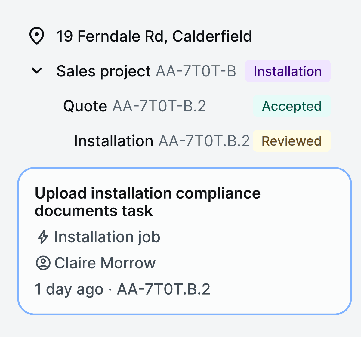 In UPowr, each job has a clear set of close-out tasks: upload regulatory documents, add the STC assignment form, update serial numbers. Everything's in one place, and reminders keep it moving so nothing stalls.